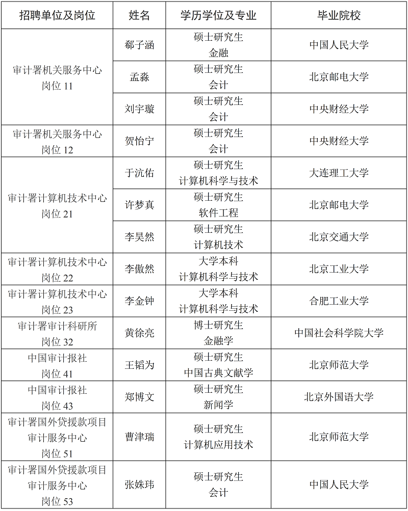 根据事业单位公开招聘工作有关规定,现将审计署京内直属事业单位2026年度公开招聘拟聘用人员予以公示。公示期间,如有问题,请向我单位反映,或直接通过中央和国家机关所属事业单位公开招聘服务平台反映。